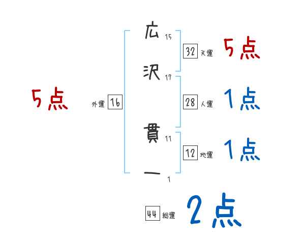 外運![]() | 広沢貫一さんの外運は16画の5つ星!人望が厚く大きく発展する。逆転成功が見える。 生活面を象徴する運勢です。外部から受ける影響力を表し、結婚運、家庭運や職場、環境への順応性を表します。 |