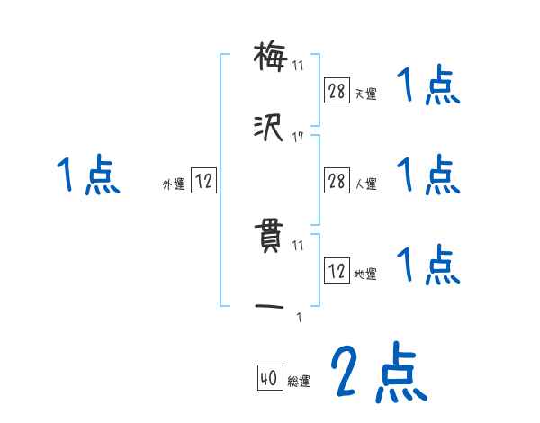 総運![]() | 梅沢貫一さんの総運は40画の2つ星!自信過剰で物事に固執するためトラブルに注意。 あなたの人生を表す1番重要な運勢です。生涯を通じて影響する総合運となり、主に50歳以降の晩年期に影響を及ぼします。 |