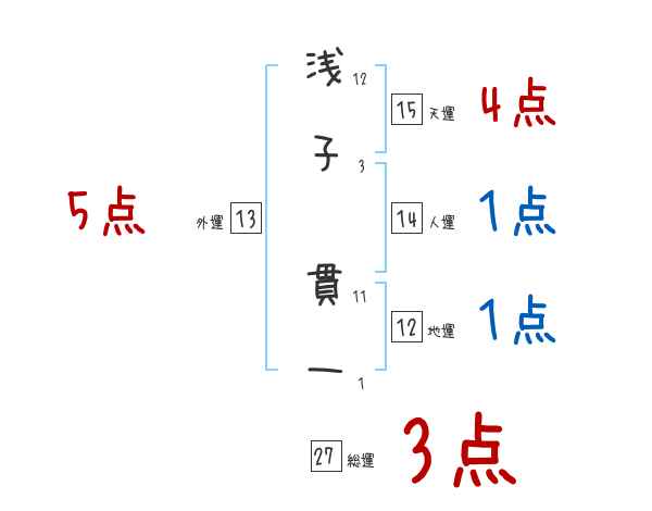 総運![]() | 浅子貫一さんの総運は27画の3つ星!頭脳明晰だが強情で摩擦が多い傾向。孤立に注意。 あなたの人生を表す1番重要な運勢です。生涯を通じて影響する総合運となり、主に50歳以降の晩年期に影響を及ぼします。 |