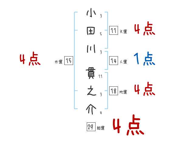 天運![]() | 小田川貫之介さんの天運は11画の4つ星!着実に富や地位を得る幸運な人生。 家系が持つ宿命的な運勢を表します。祖先から受け継いだ苗字ですので自分の力が及びません。家柄を象徴します。 |