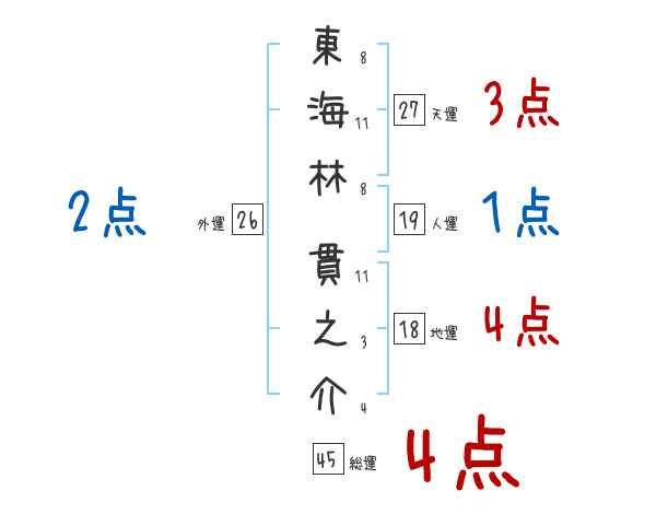 人運![]() | 東海林貫之介さんの人運は19画の1つ星!優れた才能を持ちますが、協調性が足りないことも。周りの人と協力する事を意識しましょう。 性格や才能などを表す2番目に重要な運勢です。人間関係や協調性、社会的な成功に影響します。主に20歳から50歳ぐらいまでの中年期の運勢を表します。 |