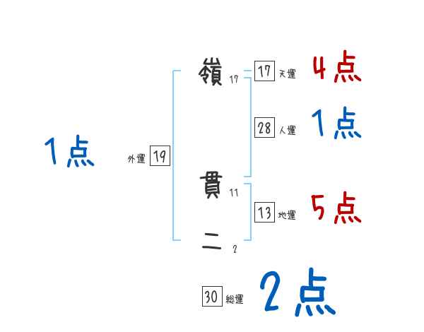 外運![]() | 嶺貫二さんの外運は19画の1つ星!優れた才能を持ちますが、協調性が足りないことも。周りの人と協力する事を意識しましょう。 生活面を象徴する運勢です。外部から受ける影響力を表し、結婚運、家庭運や職場、環境への順応性を表します。 |