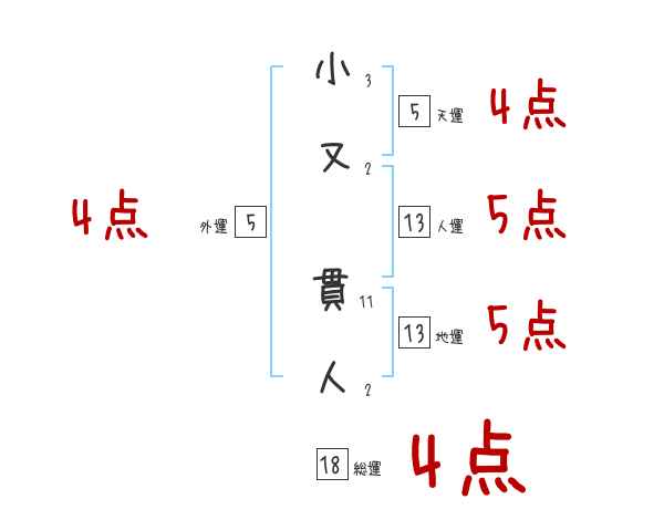 天運![]() | 小又貫人さんの天運は5画の4つ星!健康で安泰。協調性に優れ、財産に恵まれる。 家系が持つ宿命的な運勢を表します。祖先から受け継いだ苗字ですので自分の力が及びません。家柄を象徴します。 |