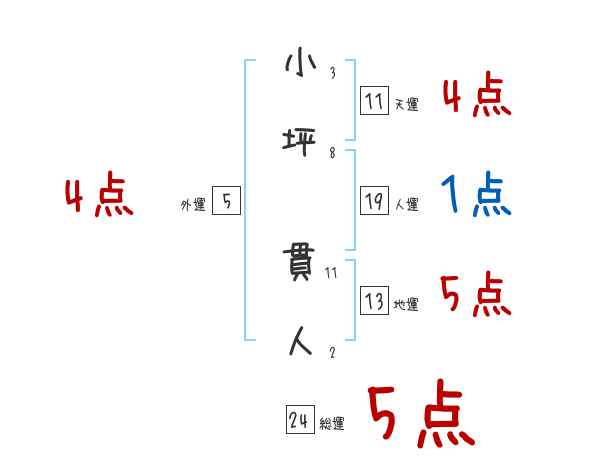 天運![]() | 小坪貫人さんの天運は11画の4つ星!着実に富や地位を得る幸運な人生。 家系が持つ宿命的な運勢を表します。祖先から受け継いだ苗字ですので自分の力が及びません。家柄を象徴します。 |