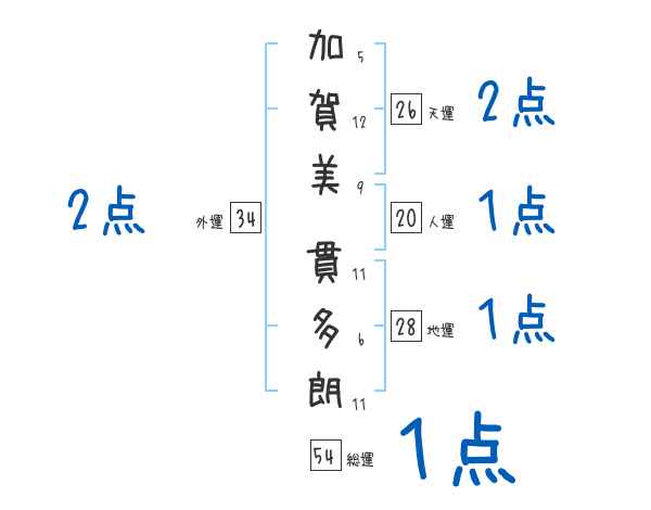 総運![]() | 加賀美貫多朗さんの総運は54画の1つ星!トラブルが多いかも。周りをよく見て協調して過ごしましょう。 あなたの人生を表す1番重要な運勢です。生涯を通じて影響する総合運となり、主に50歳以降の晩年期に影響を及ぼします。 |