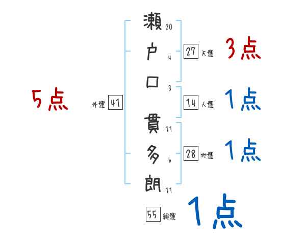 天運![]() | 瀬戸口貫多朗さんの天運は27画の3つ星!頭脳明晰だが強情で摩擦が多い傾向。孤立に注意。 家系が持つ宿命的な運勢を表します。祖先から受け継いだ苗字ですので自分の力が及びません。家柄を象徴します。 |