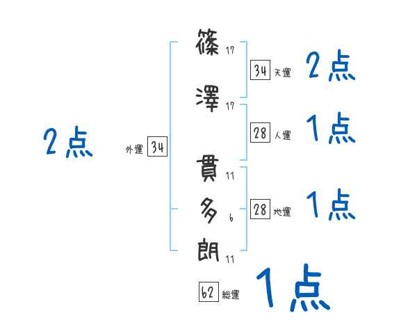 地運![]() | 篠澤貫多朗さんの地運は28画の1つ星!家庭環境に注意。スポーツで活躍できる能力があるかも。 個性を表す基礎的な運勢です。性格形成や対人関係、行動力など家庭環境に影響されます。主に誕生してから20歳くらいまでの若年期の運勢を表します。 |