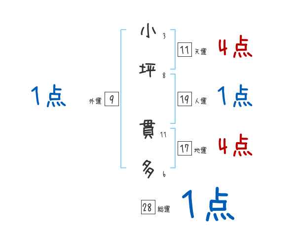 天運![]() | 小坪貫多さんの天運は11画の4つ星!着実に富や地位を得る幸運な人生。 家系が持つ宿命的な運勢を表します。祖先から受け継いだ苗字ですので自分の力が及びません。家柄を象徴します。 |