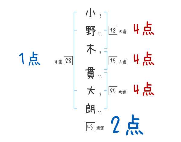 総運![]() | 小野木貫大朗さんの総運は43画の2つ星!頑固な性格で独立心が強いかも。やや非現実的で浪費に注意しましょう。 あなたの人生を表す1番重要な運勢です。生涯を通じて影響する総合運となり、主に50歳以降の晩年期に影響を及ぼします。 |