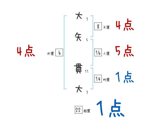 人運![]() | 大矢貫大さんの人運は16画の5つ星!人望が厚く大きく発展する。逆転成功が見える。 性格や才能などを表す2番目に重要な運勢です。人間関係や協調性、社会的な成功に影響します。主に20歳から50歳ぐらいまでの中年期の運勢を表します。 |
