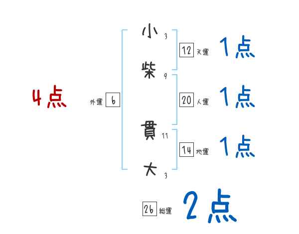 総運![]() | 小柴貫大さんの総運は26画の2つ星!波瀾万丈かも。信頼できる人を大事にしましょう。 あなたの人生を表す1番重要な運勢です。生涯を通じて影響する総合運となり、主に50歳以降の晩年期に影響を及ぼします。 |