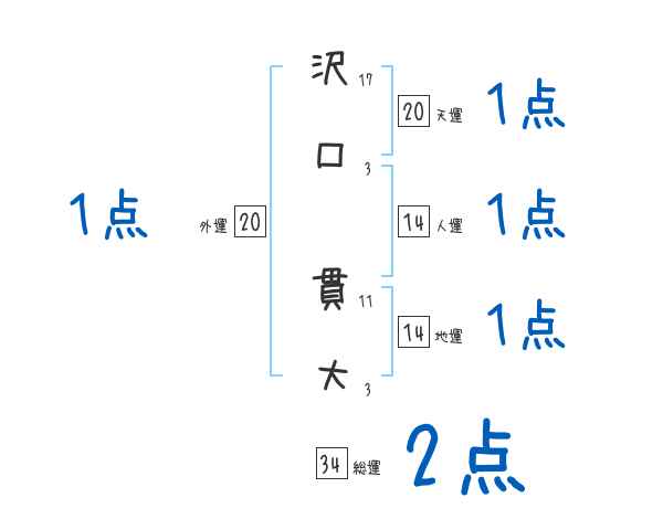 総運![]() | 沢口貫大さんの総運は34画の2つ星!独創性に優れるが、自尊心が強く災難に注意しましょう。 あなたの人生を表す1番重要な運勢です。生涯を通じて影響する総合運となり、主に50歳以降の晩年期に影響を及ぼします。 |