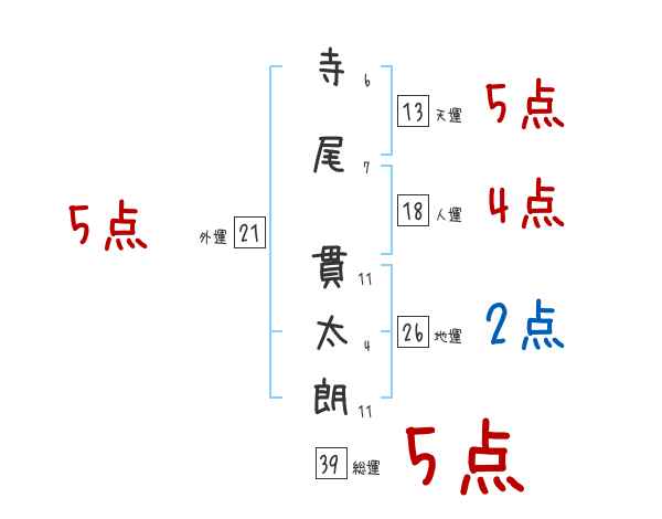 外運![]() | 寺尾貫太朗さんの外運は21画の5つ星!統率力がある。独立し成功する。名誉を手に入れる。 生活面を象徴する運勢です。外部から受ける影響力を表し、結婚運、家庭運や職場、環境への順応性を表します。 |