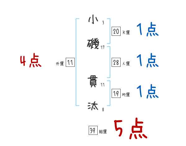 総運![]() | 小磯貫汰さんの総運は39画の5つ星!社交性に優れ人望が厚い。人の上に立ち成功する。 あなたの人生を表す1番重要な運勢です。生涯を通じて影響する総合運となり、主に50歳以降の晩年期に影響を及ぼします。 |