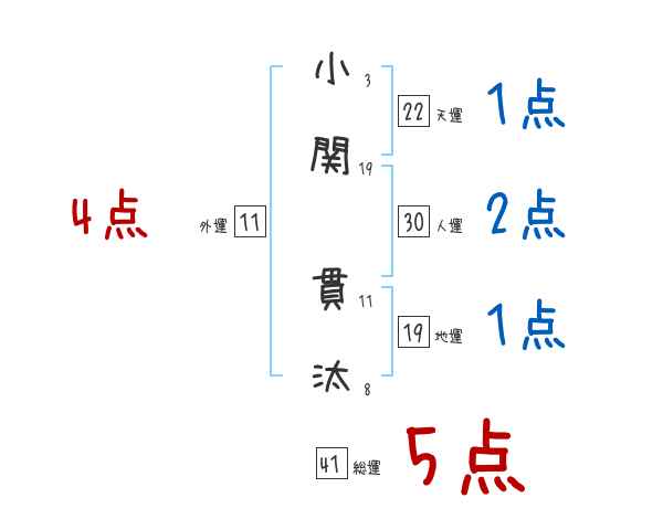 天運![]() | 小関貫汰さんの天運は22画の1つ星!努力することが苦手ないっぽう手先が器用。芸術性にも優れる。 家系が持つ宿命的な運勢を表します。祖先から受け継いだ苗字ですので自分の力が及びません。家柄を象徴します。 |