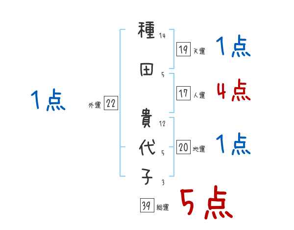 外運![]() | 種田貴代子さんの外運は22画の1つ星!努力することが苦手ないっぽう手先が器用。芸術性にも優れる。 生活面を象徴する運勢です。外部から受ける影響力を表し、結婚運、家庭運や職場、環境への順応性を表します。 |