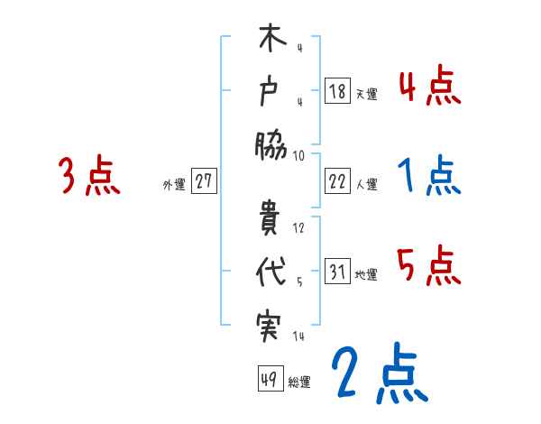 外運![]() | 木戸脇貴代実さんの外運は27画の3つ星!頭脳明晰だが強情で摩擦が多い傾向。孤立に注意。 生活面を象徴する運勢です。外部から受ける影響力を表し、結婚運、家庭運や職場、環境への順応性を表します。 |