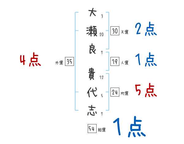 外運![]() | 大瀬良貴代志さんの外運は35画の4つ星!温厚な性格で感受性が高い。穏和な性格で人望が厚い。 生活面を象徴する運勢です。外部から受ける影響力を表し、結婚運、家庭運や職場、環境への順応性を表します。 |