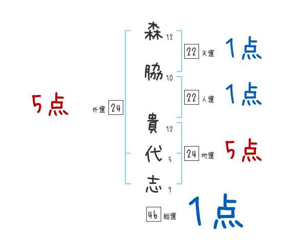 外運![]() | 森脇貴代志さんの外運は24画の5つ星!家庭運が良く順調な人生。金運にも恵まれる。 生活面を象徴する運勢です。外部から受ける影響力を表し、結婚運、家庭運や職場、環境への順応性を表します。 |