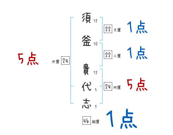 外運![]() | 須釜貴代志さんの外運は24画の5つ星!家庭運が良く順調な人生。金運にも恵まれる。 生活面を象徴する運勢です。外部から受ける影響力を表し、結婚運、家庭運や職場、環境への順応性を表します。 |