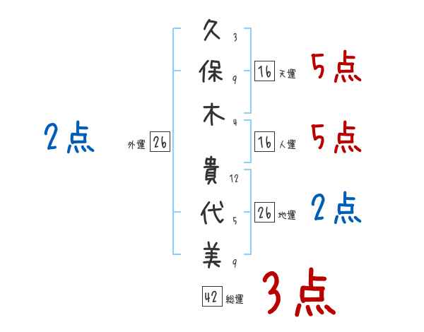 外運![]() | 久保木貴代美さんの外運は26画の2つ星!波瀾万丈かも。信頼できる人を大事にしましょう。 生活面を象徴する運勢です。外部から受ける影響力を表し、結婚運、家庭運や職場、環境への順応性を表します。 |