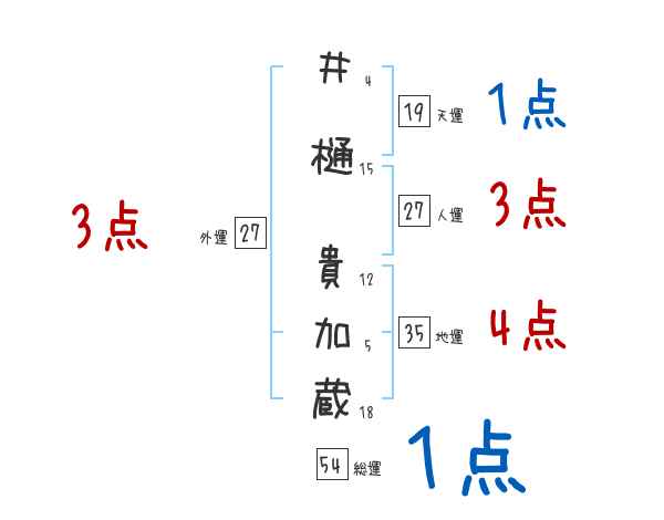 地運![]() | 井樋貴加蔵さんの地運は35画の4つ星!温厚な性格で感受性が高い。穏和な性格で人望が厚い。 個性を表す基礎的な運勢です。性格形成や対人関係、行動力など家庭環境に影響されます。主に誕生してから20歳くらいまでの若年期の運勢を表します。 |