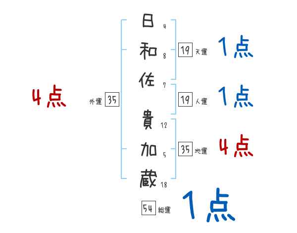 総運![]() | 日和佐貴加蔵さんの総運は54画の1つ星!トラブルが多いかも。周りをよく見て協調して過ごしましょう。 あなたの人生を表す1番重要な運勢です。生涯を通じて影響する総合運となり、主に50歳以降の晩年期に影響を及ぼします。 |