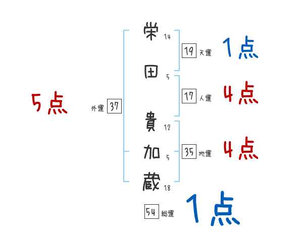 外運![]() | 栄田貴加蔵さんの外運は37画の5つ星!努力家で順応性に優れる。現実的な考え方ができ忠実に物事をこなす。 生活面を象徴する運勢です。外部から受ける影響力を表し、結婚運、家庭運や職場、環境への順応性を表します。 |