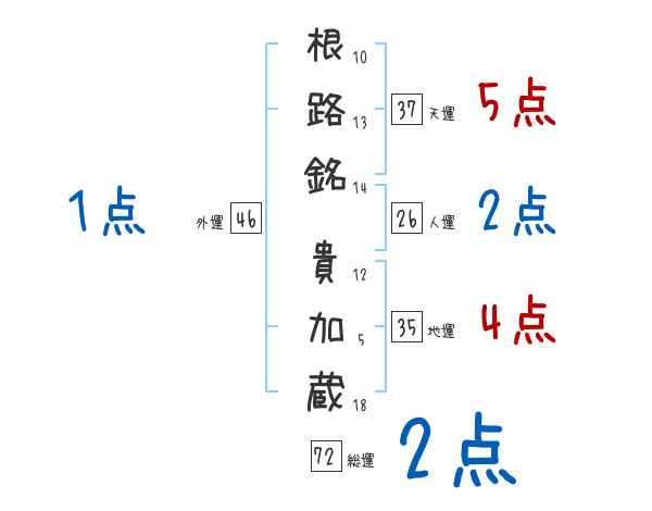 地運![]() | 根路銘貴加蔵さんの地運は35画の4つ星!温厚な性格で感受性が高い。穏和な性格で人望が厚い。 個性を表す基礎的な運勢です。性格形成や対人関係、行動力など家庭環境に影響されます。主に誕生してから20歳くらいまでの若年期の運勢を表します。 |