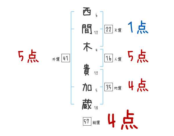 西間木貴加蔵さんの画数の鑑定結果