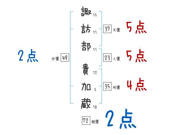 総運![]() | 諏訪部貴加蔵さんの総運は72画の2つ星!災難が多く不安定な生活にならないように注意。明暗のある人生かも。 あなたの人生を表す1番重要な運勢です。生涯を通じて影響する総合運となり、主に50歳以降の晩年期に影響を及ぼします。 |