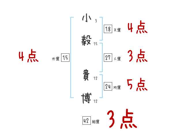 外運![]() | 小毅貴博さんの外運は15画の4つ星!人徳があり出世する。順調に物事を進め円満な人生。 生活面を象徴する運勢です。外部から受ける影響力を表し、結婚運、家庭運や職場、環境への順応性を表します。 |