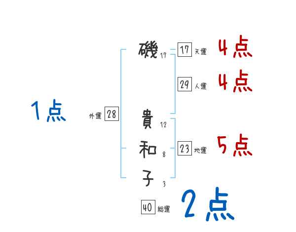 人運![]() | 磯貴和子さんの人運は29画の4つ星!完全主義で才能がある。厳格な心の持ち主。 性格や才能などを表す2番目に重要な運勢です。人間関係や協調性、社会的な成功に影響します。主に20歳から50歳ぐらいまでの中年期の運勢を表します。 |
