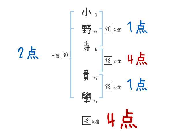 外運![]() | 小野寺貴學さんの外運は30画の2つ星!浮き沈みの激しさに注意しましょう。 生活面を象徴する運勢です。外部から受ける影響力を表し、結婚運、家庭運や職場、環境への順応性を表します。 |