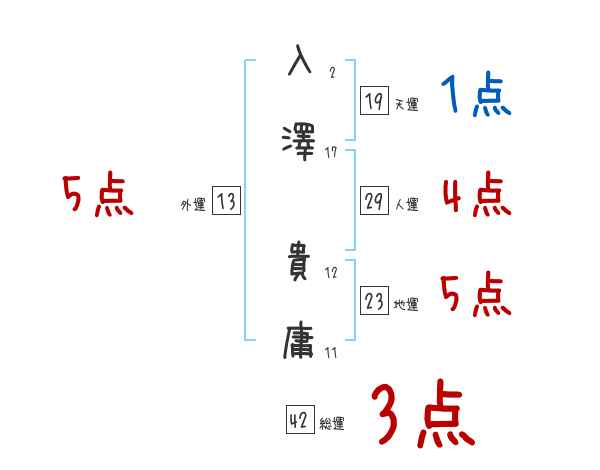 人運![]() | 入澤貴庸さんの人運は29画の4つ星!完全主義で才能がある。厳格な心の持ち主。 性格や才能などを表す2番目に重要な運勢です。人間関係や協調性、社会的な成功に影響します。主に20歳から50歳ぐらいまでの中年期の運勢を表します。 |