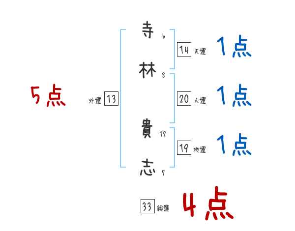 外運![]() | 寺林貴志さんの外運は13画の5つ星!才能に恵まれ人気がある。名声を手に入れる。円満な人生。 生活面を象徴する運勢です。外部から受ける影響力を表し、結婚運、家庭運や職場、環境への順応性を表します。 |