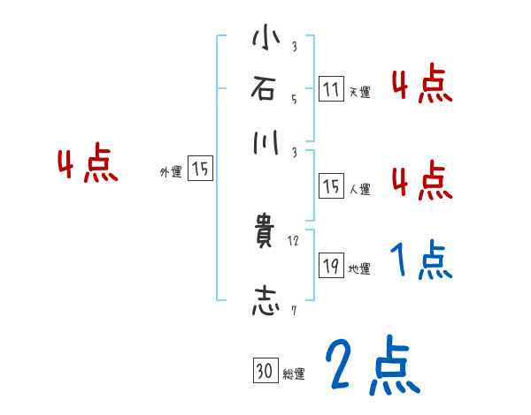 外運![]() | 小石川貴志さんの外運は15画の4つ星!人徳があり出世する。順調に物事を進め円満な人生。 生活面を象徴する運勢です。外部から受ける影響力を表し、結婚運、家庭運や職場、環境への順応性を表します。 |