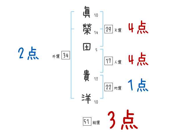 天運![]() | 眞榮田貴洋さんの天運は29画の4つ星!完全主義で才能がある。厳格な心の持ち主。 家系が持つ宿命的な運勢を表します。祖先から受け継いだ苗字ですので自分の力が及びません。家柄を象徴します。 |