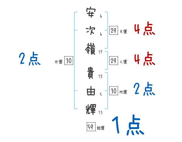 天運![]() | 安次嶺貴由輝さんの天運は29画の4つ星!完全主義で才能がある。厳格な心の持ち主。 家系が持つ宿命的な運勢を表します。祖先から受け継いだ苗字ですので自分の力が及びません。家柄を象徴します。 |