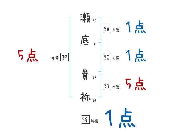 地運![]() | 瀬底貴祢さんの地運は31画の5つ星!社交性があり判断力に優れる。順風満帆な人生で円満な生活。 個性を表す基礎的な運勢です。性格形成や対人関係、行動力など家庭環境に影響されます。主に誕生してから20歳くらいまでの若年期の運勢を表します。 |