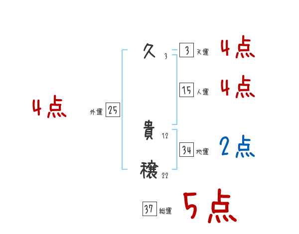 天運![]() | 久貴穣さんの天運は3画の4つ星!活動的で才能に恵まれ、多くの信頼を得る。希望に満ち成長する。 家系が持つ宿命的な運勢を表します。祖先から受け継いだ苗字ですので自分の力が及びません。家柄を象徴します。 |