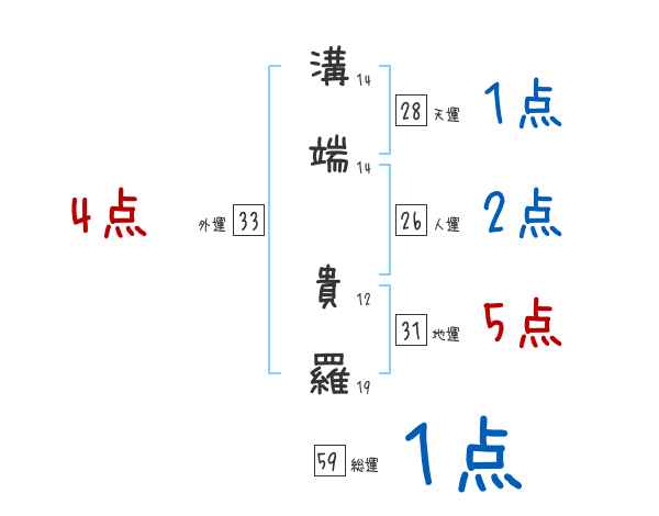 天運![]() | 溝端貴羅さんの天運は28画の1つ星!家庭環境に注意。スポーツで活躍できる能力があるかも。 家系が持つ宿命的な運勢を表します。祖先から受け継いだ苗字ですので自分の力が及びません。家柄を象徴します。 |