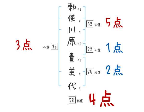天運![]() | 勅使川原貴美代さんの天運は32画の5つ星!柔軟性があり成功する。チャンスが多く金運が良い。 家系が持つ宿命的な運勢を表します。祖先から受け継いだ苗字ですので自分の力が及びません。家柄を象徴します。 |