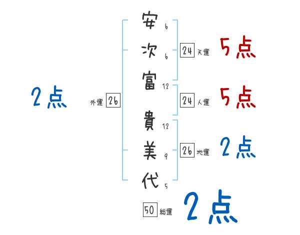 天運![]() | 安次富貴美代さんの天運は24画の5つ星!家庭運が良く順調な人生。金運にも恵まれる。 家系が持つ宿命的な運勢を表します。祖先から受け継いだ苗字ですので自分の力が及びません。家柄を象徴します。 |