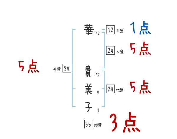 人運![]() | 華貴美子さんの人運は24画の5つ星!家庭運が良く順調な人生。金運にも恵まれる。 性格や才能などを表す2番目に重要な運勢です。人間関係や協調性、社会的な成功に影響します。主に20歳から50歳ぐらいまでの中年期の運勢を表します。 |