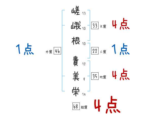 天運![]() | 嵯峨根貴美栄さんの天運は33画の4つ星!権力志向でプライドが高い。勇気があり運を切り開き成功する。 家系が持つ宿命的な運勢を表します。祖先から受け継いだ苗字ですので自分の力が及びません。家柄を象徴します。 |