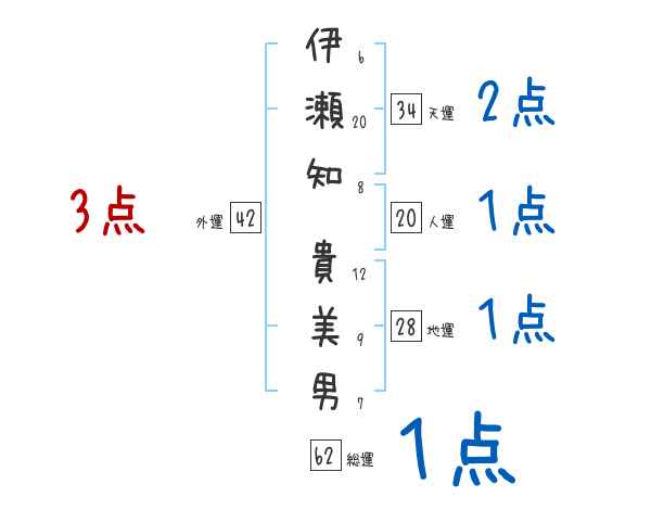 外運![]() | 伊瀬知貴美男さんの外運は42画の3つ星!病気に注意。多芸であるが消極的でおとなしい。 生活面を象徴する運勢です。外部から受ける影響力を表し、結婚運、家庭運や職場、環境への順応性を表します。 |