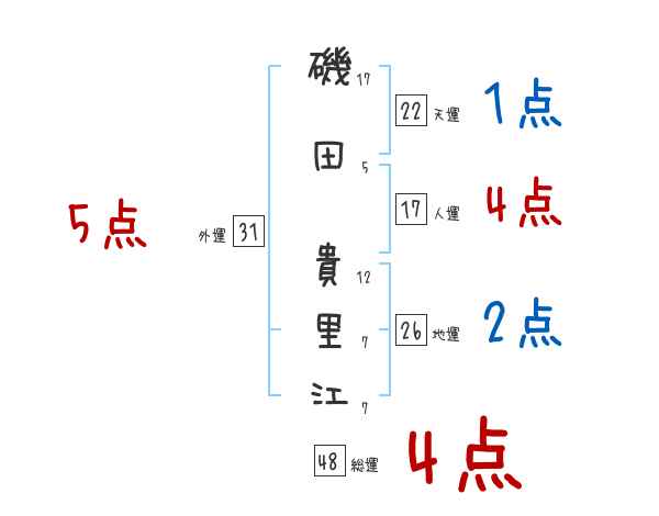 外運![]() | 磯田貴里江さんの外運は31画の5つ星!社交性があり判断力に優れる。順風満帆な人生で円満な生活。 生活面を象徴する運勢です。外部から受ける影響力を表し、結婚運、家庭運や職場、環境への順応性を表します。 |