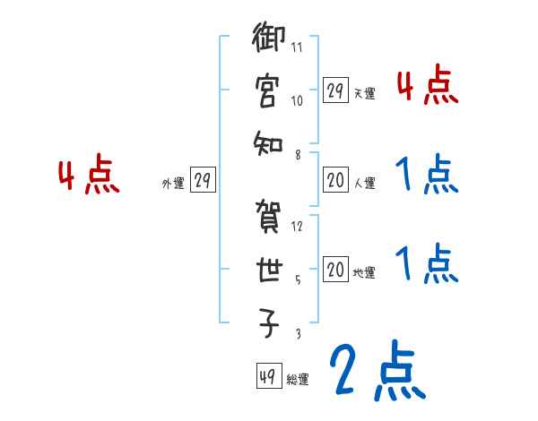 外運![]() | 御宮知賀世子さんの外運は29画の4つ星!完全主義で才能がある。厳格な心の持ち主。 生活面を象徴する運勢です。外部から受ける影響力を表し、結婚運、家庭運や職場、環境への順応性を表します。 |
