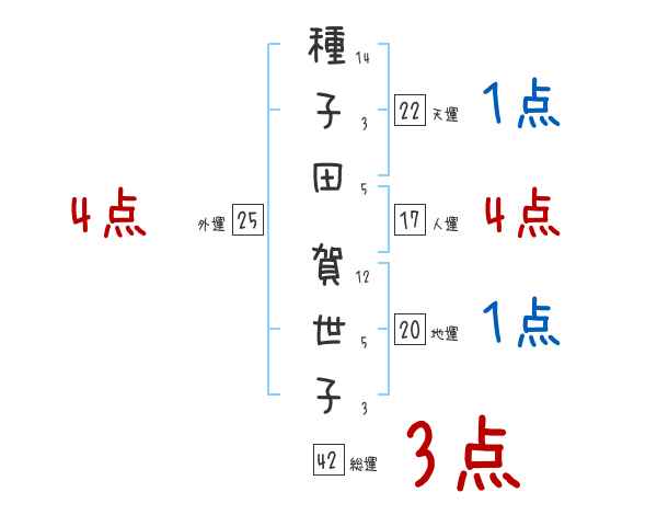 総運![]() | 種子田賀世子さんの総運は42画の3つ星!病気に注意。多芸であるが消極的でおとなしい。 あなたの人生を表す1番重要な運勢です。生涯を通じて影響する総合運となり、主に50歳以降の晩年期に影響を及ぼします。 |